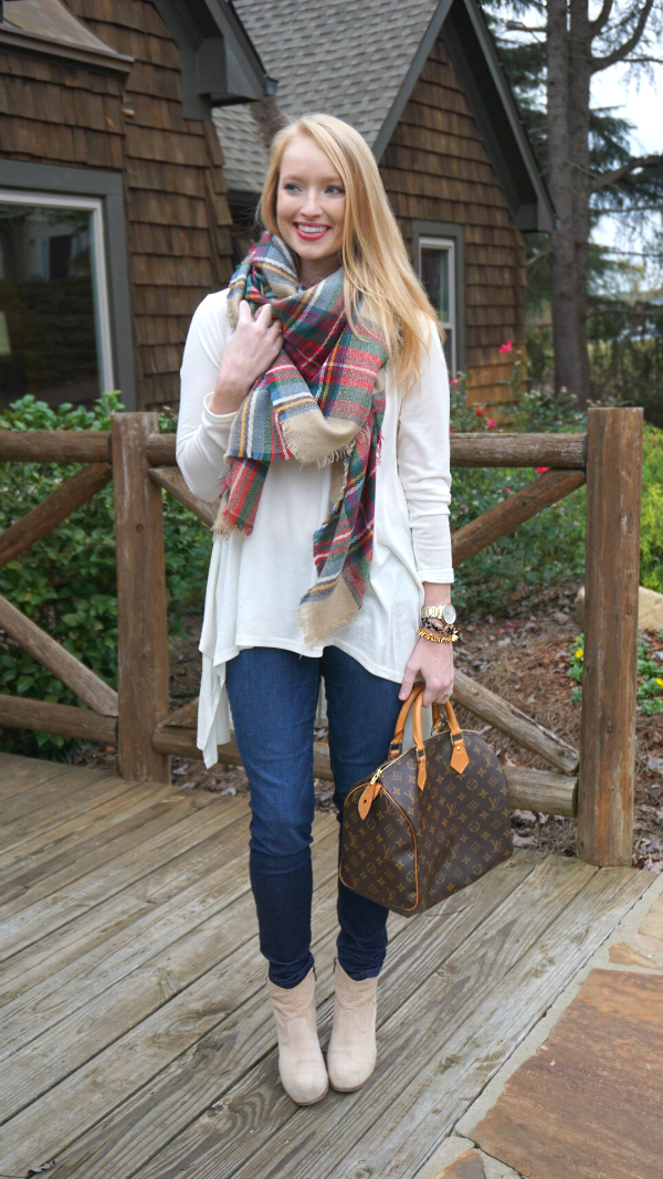 Top: Shop Dress Up / Jeans: Nordstrom Rack / Booties old (similar, similar) / Scarf: linked below / Lip color: Buxom