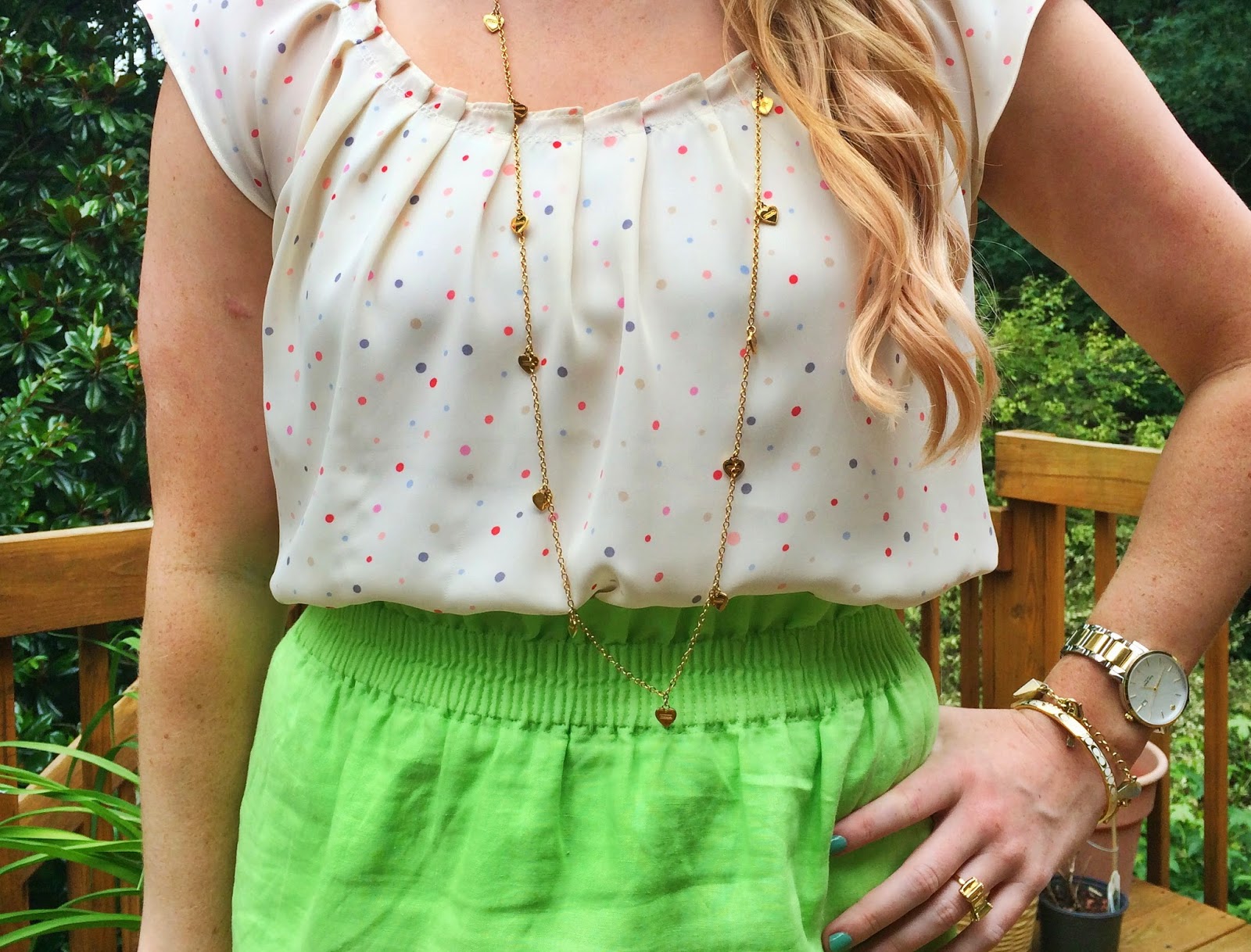 I love this top from Kohl’s, it reminds me of funfetti plus has pleats around the neck that ties into a bow in the back (I know right!). As for the skirt I do need to point out that these pictures were taken after ironing it, so if want to purchase it just know it wrinkles as soon as you sit/bend.
