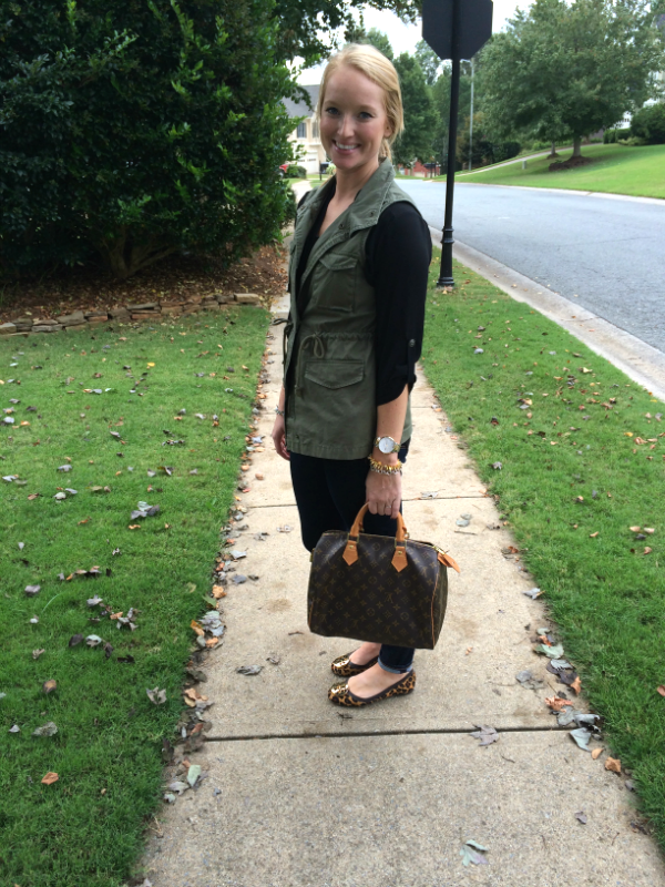 That can probably go down in history as the cheesiest title ever on SCxo, but it is what it is… There’s so many ways to style an olive vest during the fall season, and this look is one of my favorites for everyday wear. You can throw it over dresses, sweaters, and stripe/flannel/solid tops for an effortless layered look. And don’t act surprised that I paired it with leopard flats. These are still in the breaking- in stage, but I’d say they are well worth the blister on my heel.
