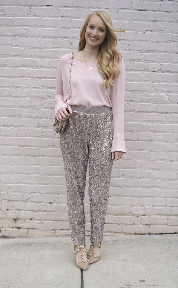 I paired these Chico’s pants with a blush bell top, but I think it would also pair nicely with a black turtle neck and a bright lip to be extra chic! My shoes are pretty old from Sole Society and they bring them back every now and then (they’re back here!), but I love this Valentino dupe just as much and I’m trying not to justify buying three more colors 🙈 For as deadly as these shoes look, they’re actually the most comfortable heel I own! Meaning, I actually leave the house in them vs wishful thinking and change into flats before I leave. 😜